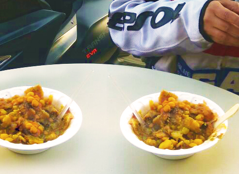 It is basically moong dal mixed with garlic chutney served on maida pappad, garnished with chopped onion tomato coriander, pinch of black pepper and sprinkles of lime juice, truly sensational for the taste buds.